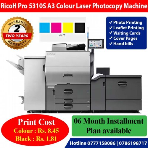 RicoH Pro C5310S Production Colour Printer Machine Sri Lanka sale with discount price and life timer free service. Only Rs. 13.00 cost per full colour A4 Laser Print. Very good for high volume printing Press, Studios, and Office Printing companies.